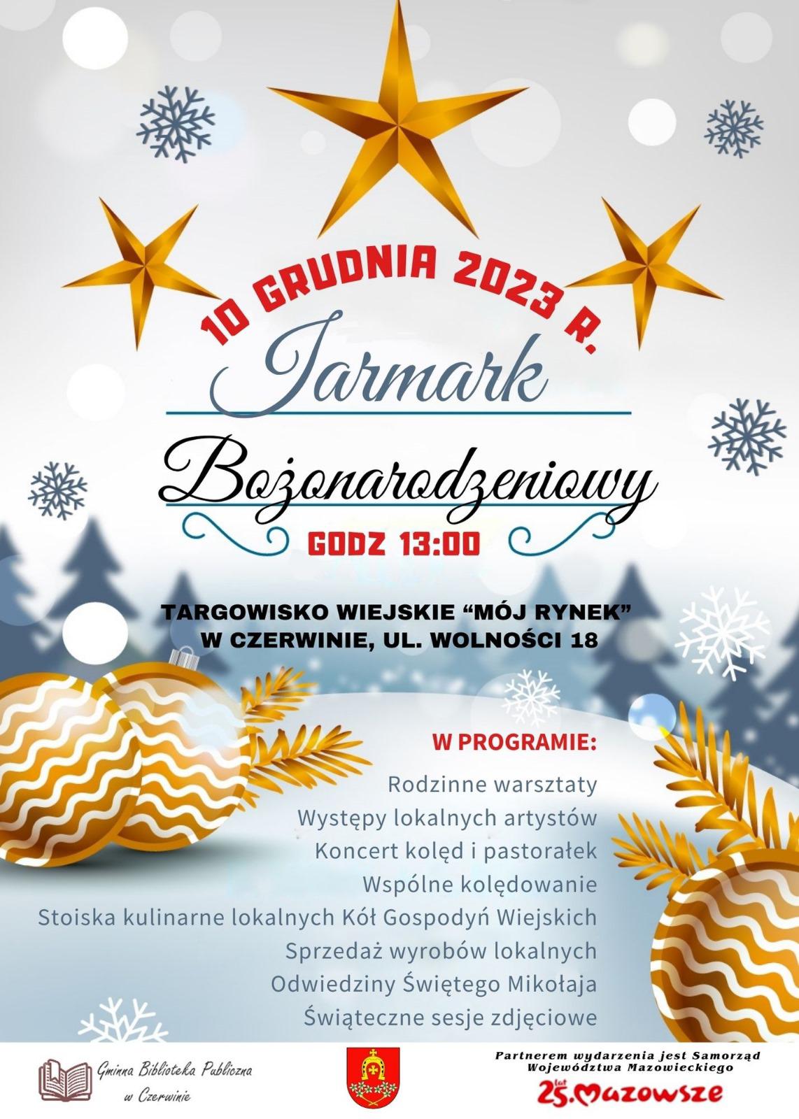 Katarzyna Kossakowska Informacje 27 listopad 2023 Jarmark Bożonarodzeniowy Drukuj E-mail Previous article: Koncert Bożonarodzeniowy Poprzedni artykuł Next article: Ogłoszenie o naborze na Kierownika Zakładu Gospodarki Komunalnej w Czerwinie Następny artykuł