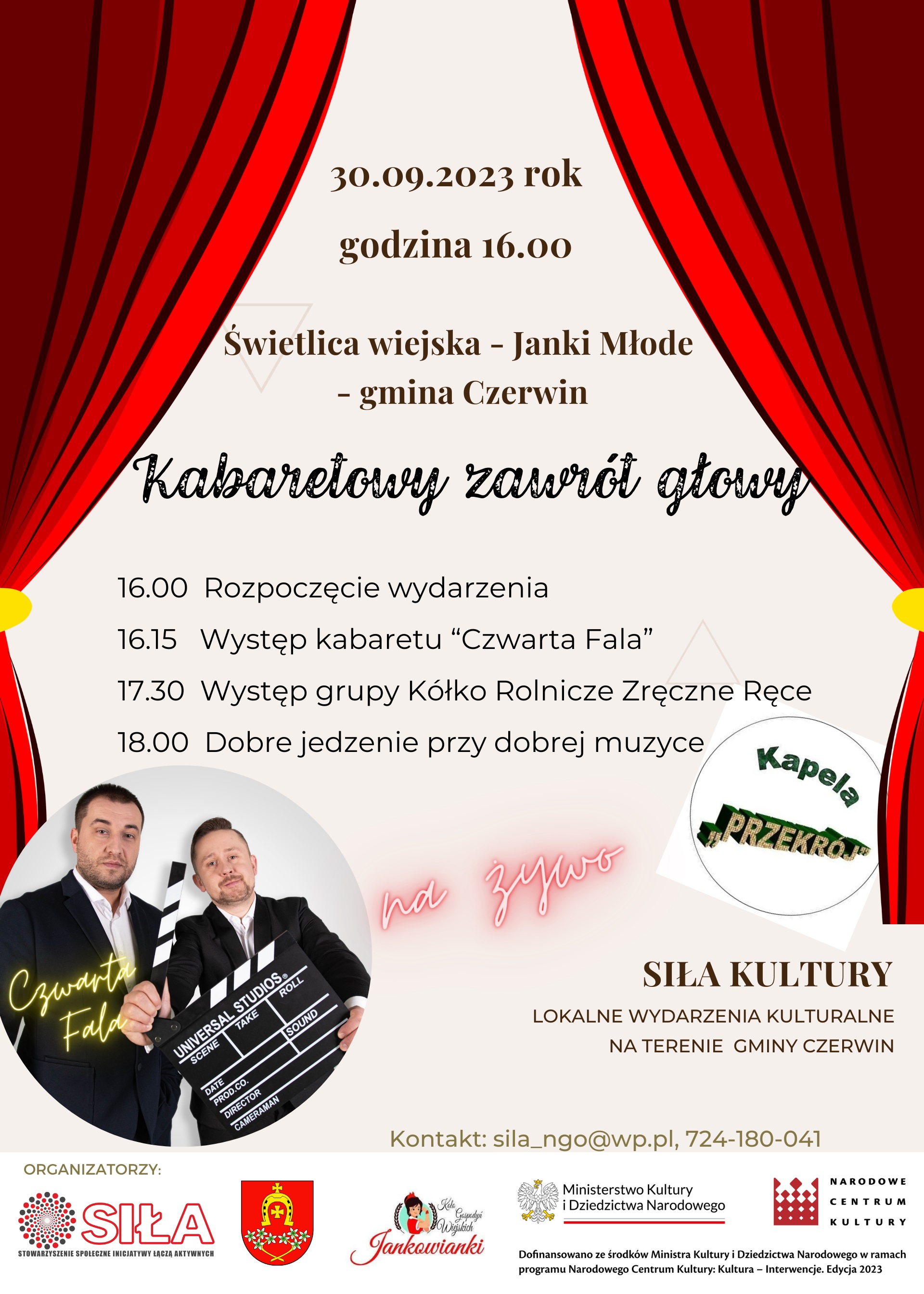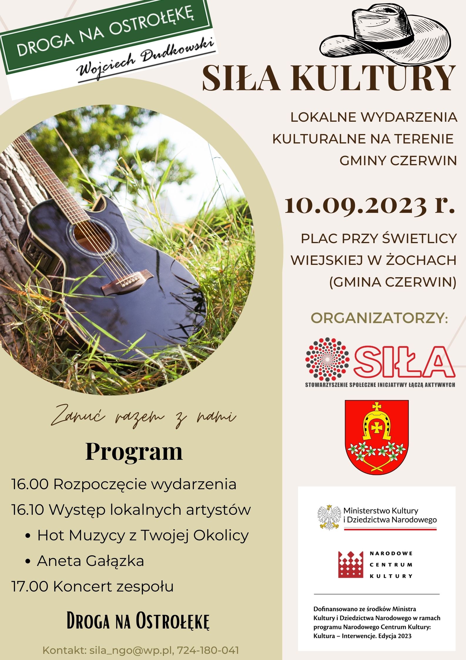 Gmina Czerwin jest partnerem Stowarzyszenia SIŁA w realizacji zadania pn.: "SIŁA KULTURY - lokalne wydarzenia na terenie Gminy Czerwin" dofinansowanego ze środków Ministra Kultury i Dziedzictwa Narodowego w ramach programu Narodowego Centrum Kultury: Kultura-Interwencje. Edycja 2023".