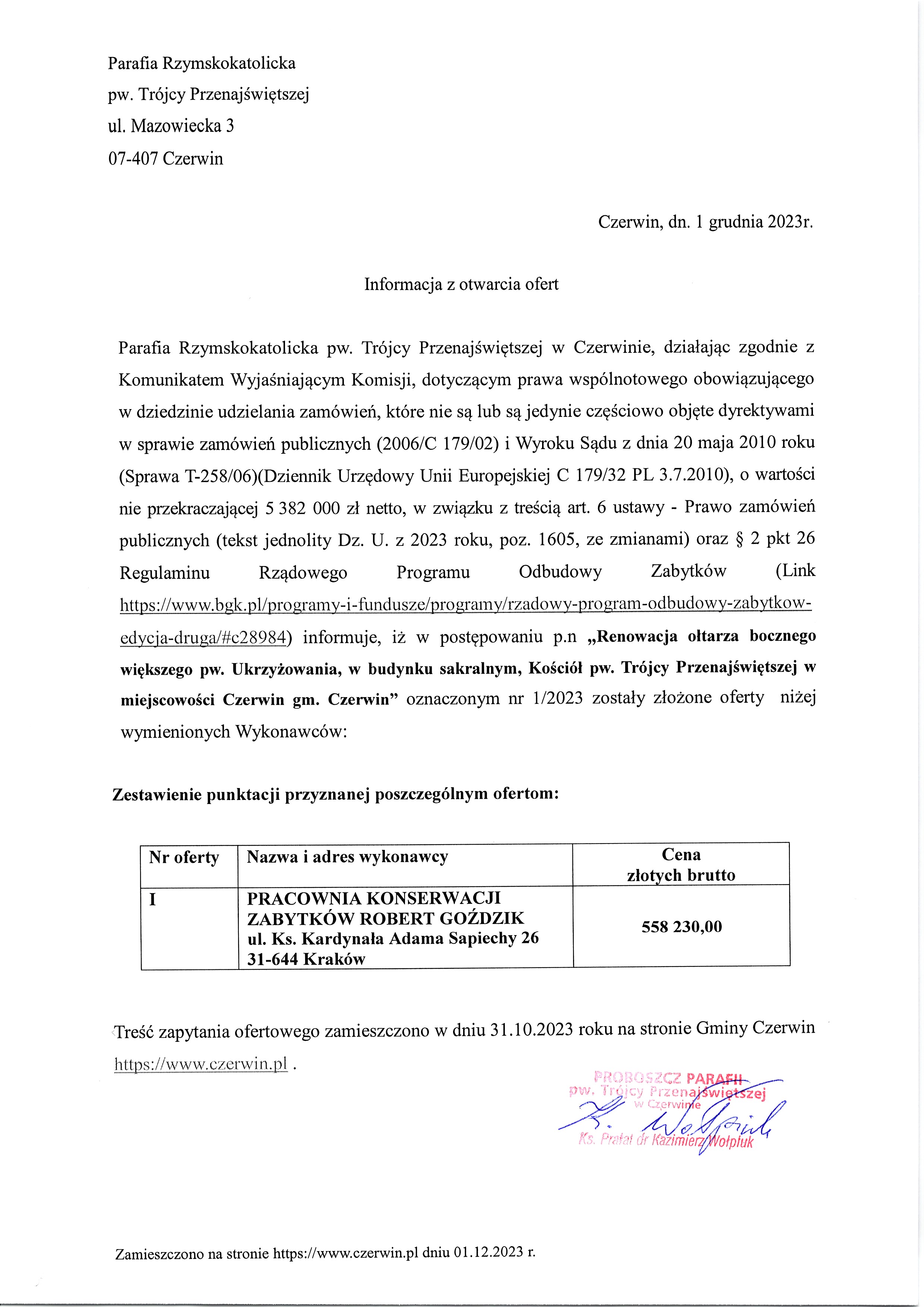 Informacja z otwarcia ofert dla zadania pn. "Renowacja ołtarza bocznego większego pw. Ukrzyżowania, w budynku sakralnym, Kościół pw. Trójcy Przenajświętszej w miejscowości Czerwin gm. Czerwin".