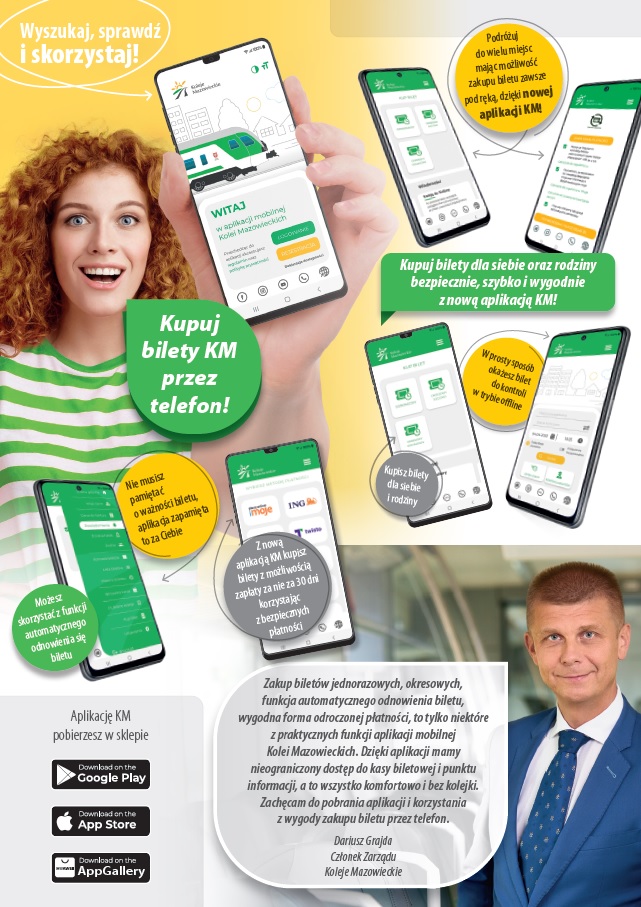 „Od 23 sierpnia można już korzystać z nowoczesnej i intuicyjnej aplikacji mobilnej Kolei Mazowieckich. To jedyna aplikacja umożliwiająca zakup biletów okresowych. Posiada również funkcję automatycznego odnowienia biletu, odroczonej płatności oraz proponuje najkorzystniejszą ofertę cenową. Dzięki aplikacji mamy nieograniczony dostęp do kasy biletowej i punktu informacji, a to wszystko komfortowo i bez kolejki.
