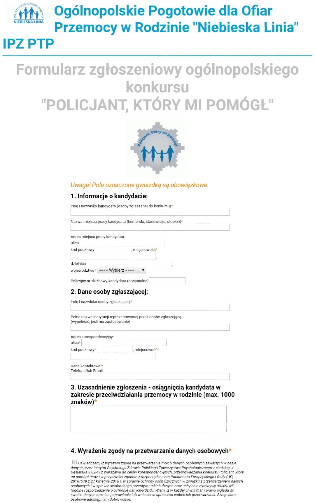 Formularz zgłoszeniowy można przesłać na adres Ten adres pocztowy jest chroniony przed spamowaniem. Aby go zobaczyć, konieczne jest włączenie w przeglądarce obsługi JavaScript. lub pocztą na adres "Niebieska Linia", 02-121 Warszawa ul. Korotyńskiego 13.