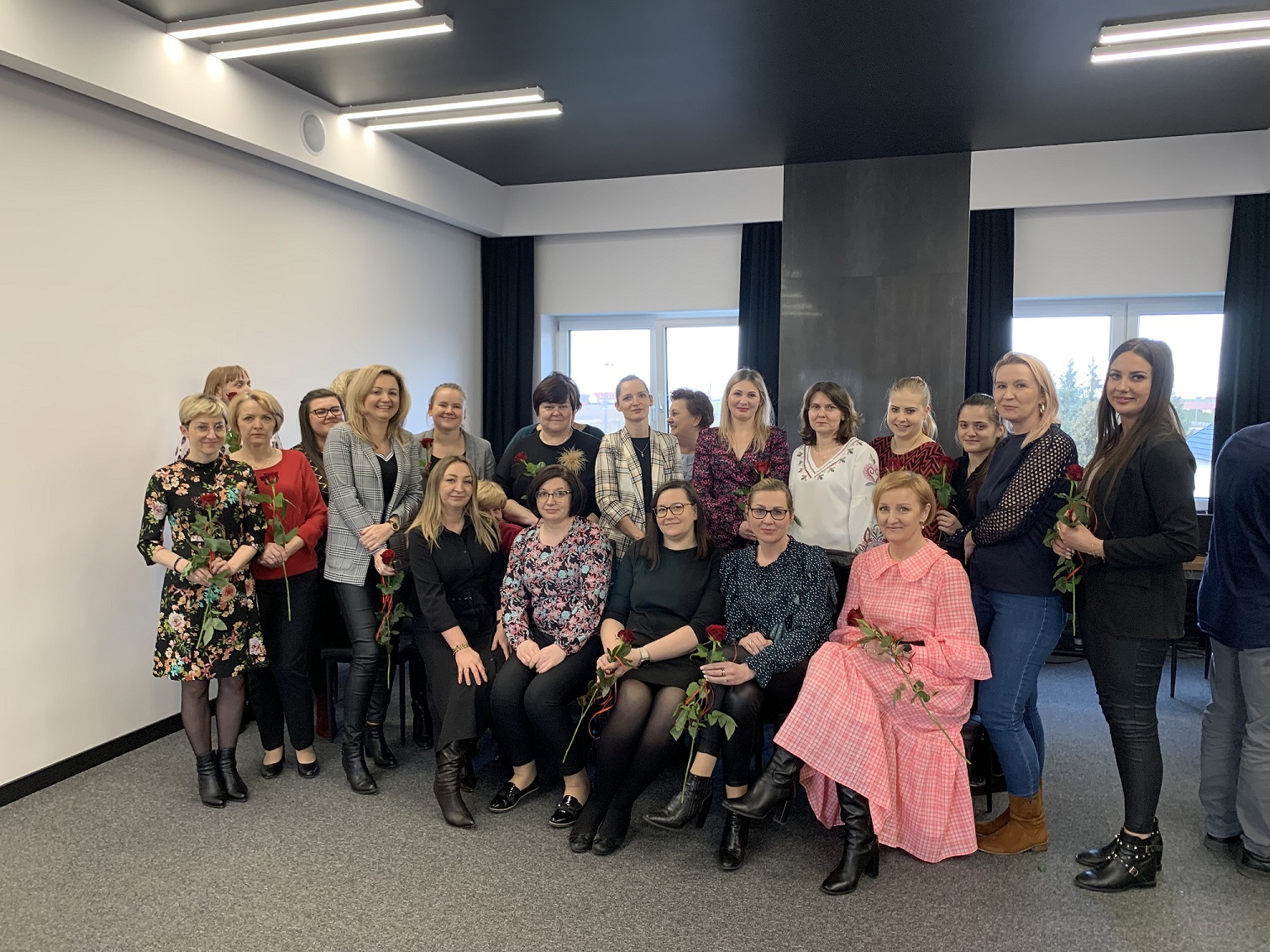 panem Markiem Gawkowskim, radnym Rady Gminy Czerwin, panem Michałem Pęksą, Kierownikiem Ośrodka Pomocy Społecznej w Czerwinie oraz panem Bogusławem Pstrągowskim, pracownikiem Urzędu Gminy Czerwin, przygotowali dla pań niespodziankę. W sali konferencyjnej urzędu, punktualnie o 15.00, zebrały się panie - pracownice urzędu, instytucji podległych oraz radne. Na panie czekały kwiaty i pyszny tort. Pan wójt w imieniu wszystkich panów złożył obecnym życzenia zdrowia, szczęścia, pomyślności, docenienia przez mężczyzn i więcej czasu dla siebie. Wydarzenie zostało uwiecznione na wspólnej fotografii.