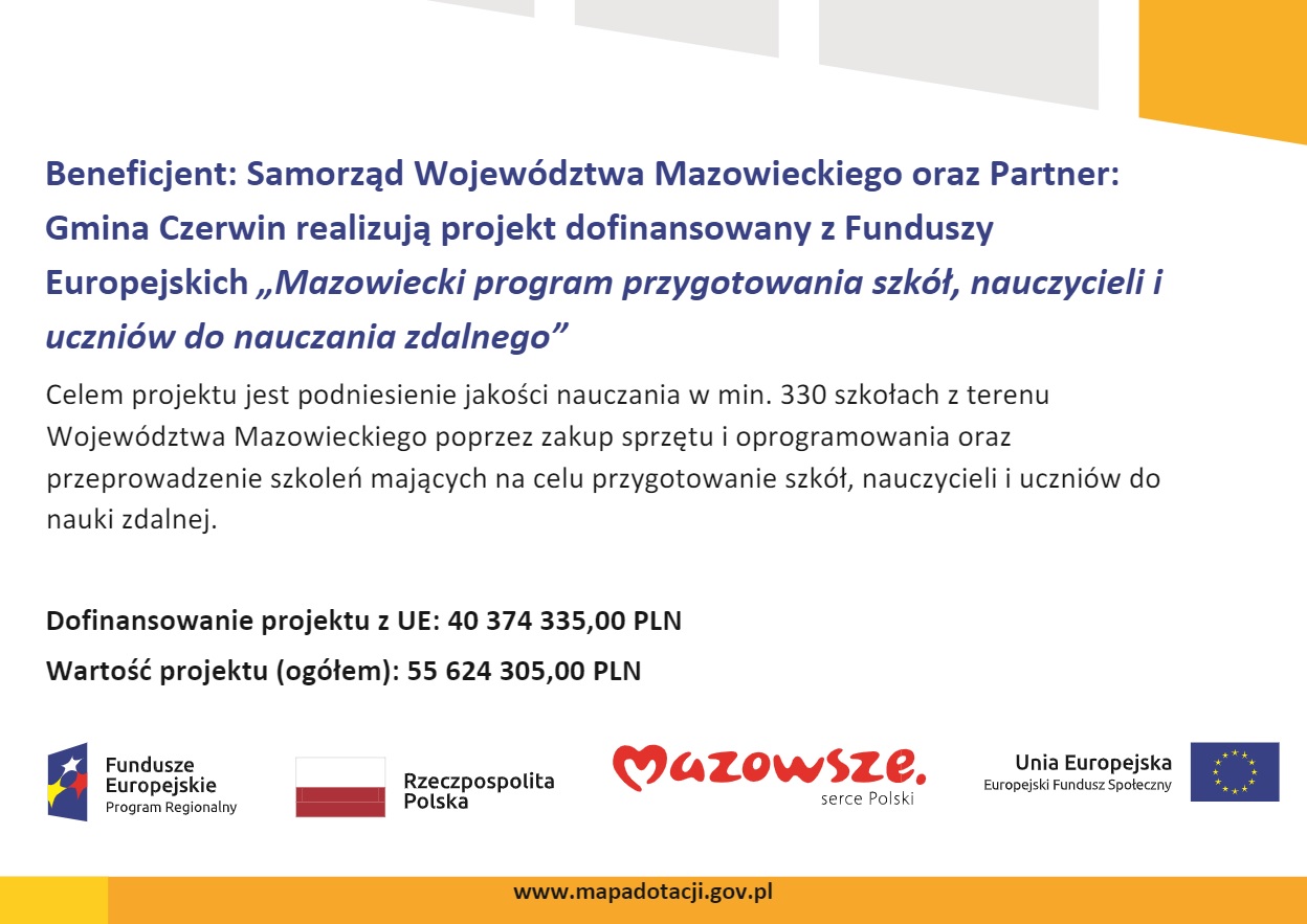 Gmina Czerwin planuje złożyłć wniosek w ramach Konkursu Grantowego Cyfrowa Gmina - Wsparcie dzieci z rodzin pegeerowskich w rozwoju cyfrowym –„Granty PPGR”. Cel projektu - wsparcie rodzin popegeerowskich z dziećmi w zakresie dostępu do sprzętu komputerowego oraz dostępu do Internetu.